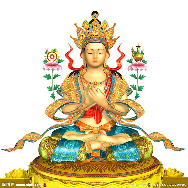 因弥勒的梵文意义为慈爱,所以常被称为慈氏,其名字为“无能胜”。他出身于印度婆罗门,后得释迦牟尼佛的教化,被授记为下一任佛陀。他现处兜率天内院,为一生补处菩萨。弥勒菩萨袒胸露腹、笑容可掬的形像深受众人喜爱;但在胎藏界的形像是,左手当胸,手掌张开,右手执莲花,所戴宝冠中有宝塔,塔中现舍利;在金刚界的形像是,右手大拇指、食指、小指均竖立,中指与无名指弯曲置胸前,左手放在膝上。