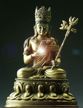 因发下“地狱未空誓不成佛,众生度尽方证菩提”的宏愿,密宗又称之为悲愿金刚、与愿金刚或金刚幢,因其安忍不动如大地,静虑深密如秘藏,故称为地藏。在释迦佛入灭以后,弥勒未生之前,地藏菩萨肩负着救度六道众生的重大使命。地藏菩萨现出家菩萨像,其雕像为僧侣打扮,左手擎宝珠,右手持锡杖。